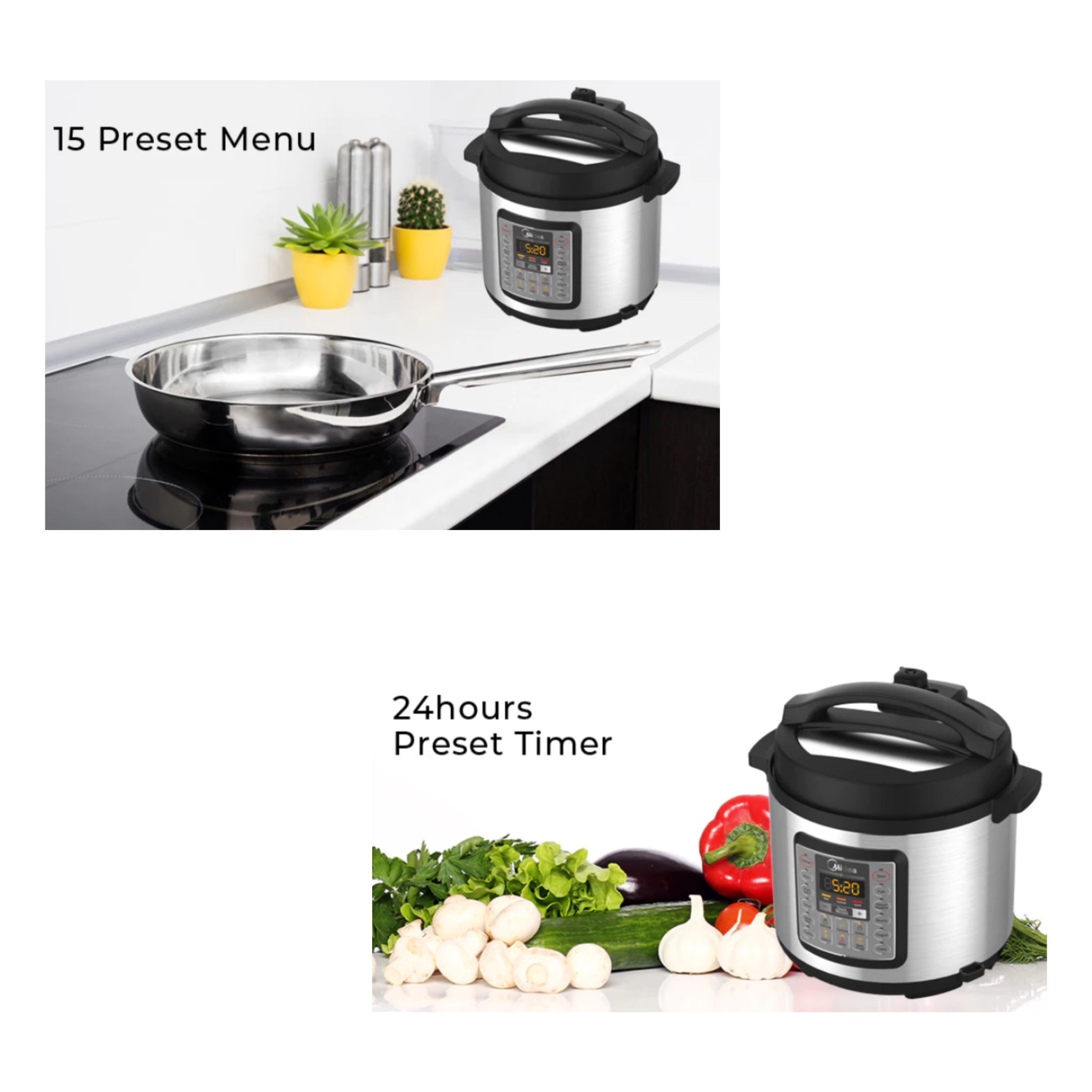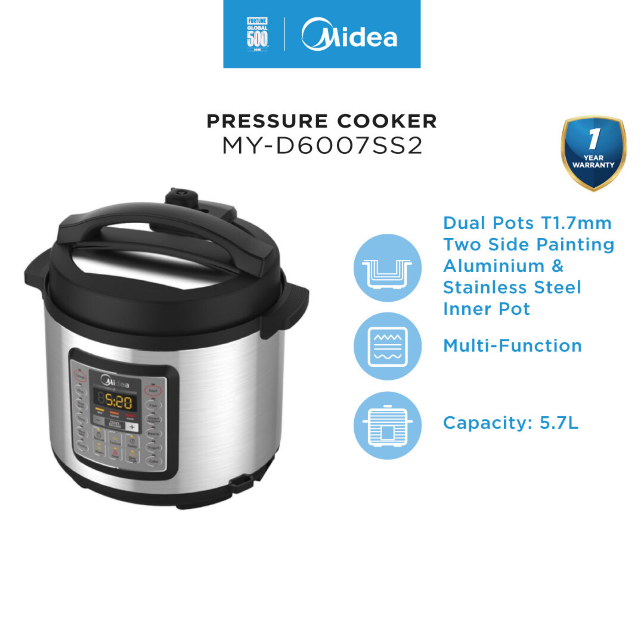 • Capacity 5.7L • Power Consumption 1000W • Working Pressure 70kPa • Stainless Steel Housing • Dual Inner Pots 1 Non-Stick Inner Pot & 1 Stainless Steel Inner Pot • Large Control Box And Digital LED Display • Pressure Indicator Showing The Pressure Status • Multi-Functions - 15 Preset Menu • 24 Hours Preset Timer • When The Lid Is Not Properly Secured, Function Keys Will Be Blocked By A Failsafe Switch • 9 Safety Guard