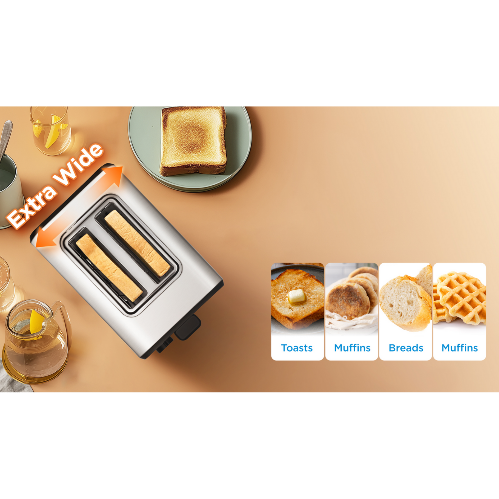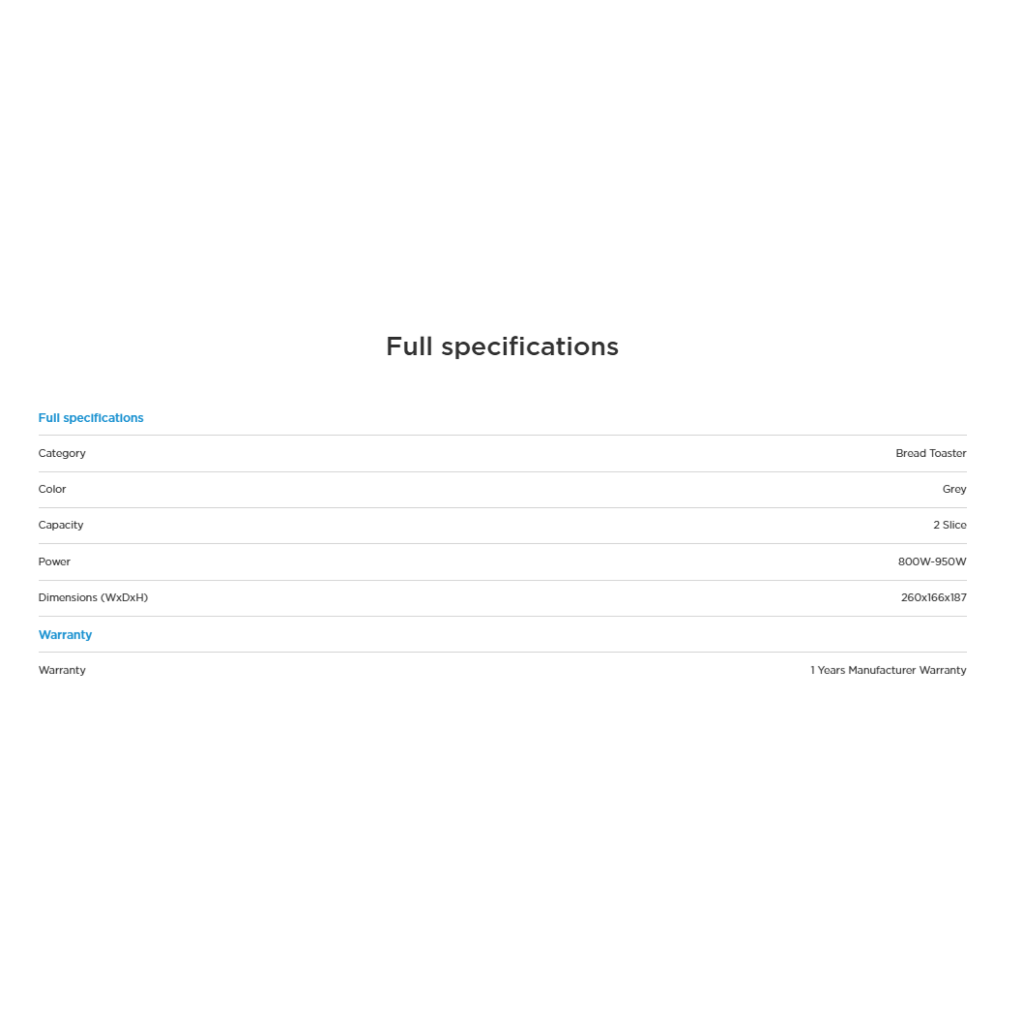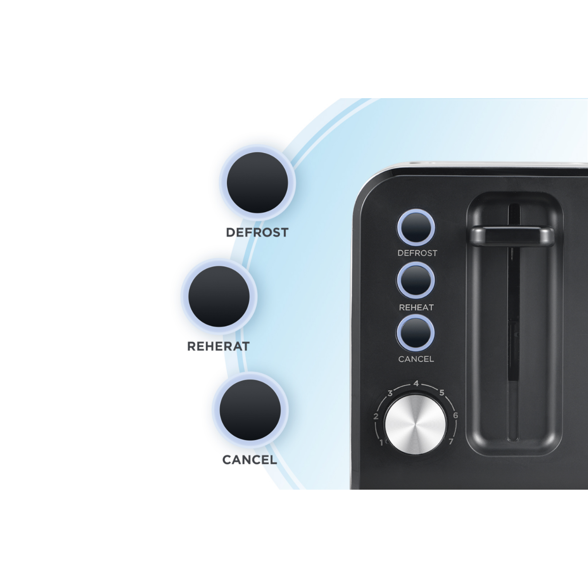 • Capacity: 2-Slice • Power: 950W • Type: Bread Toaster • Features: Defrost/Reheat/Cancel, Browning Control, Black • Warranty: 1 Year General Warranty