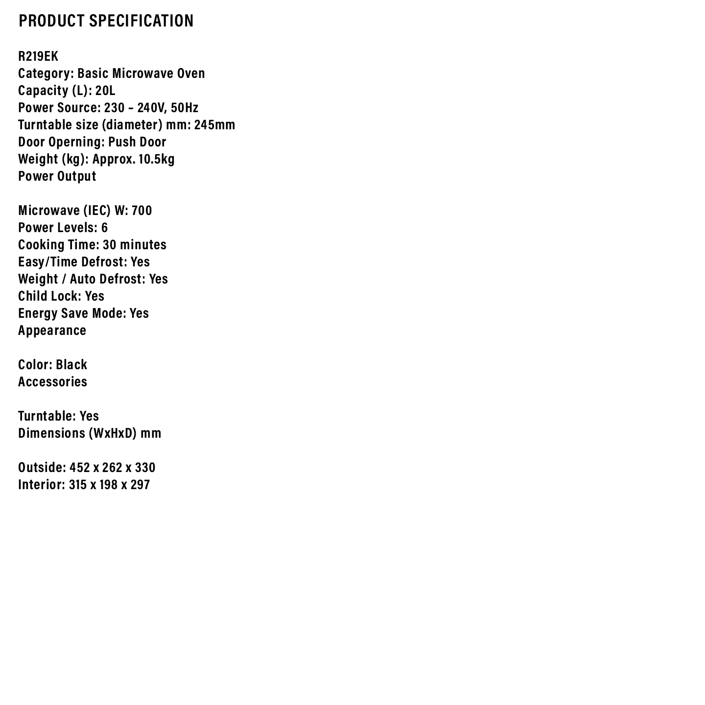 Sharp 20L Microwave R219EK. Fast and simple kitchen heating. Wide turntable for even cooking. Reliable Sharp motor. Buy online for quick meals.