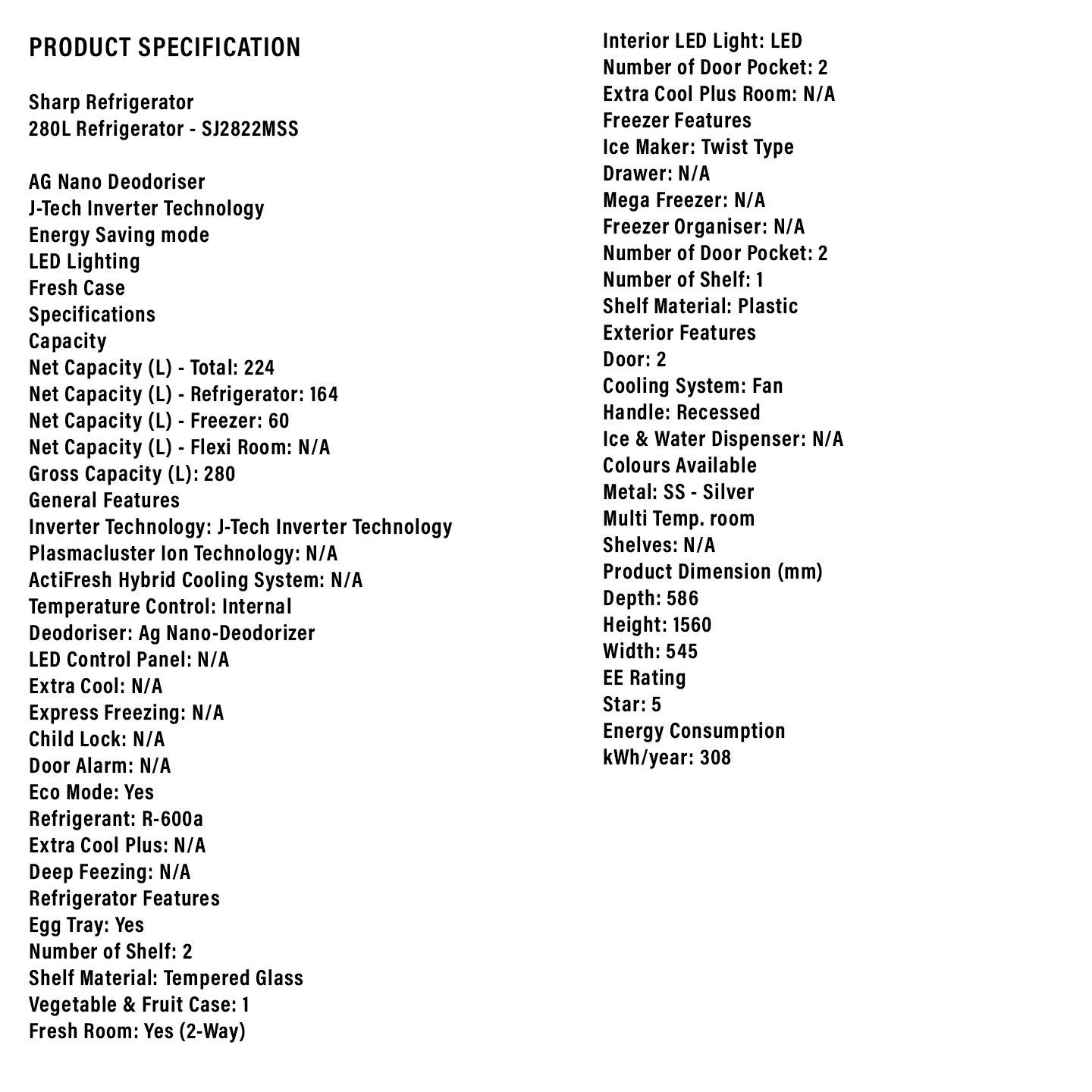 Sharp 280L Fridge SJ2822MSS. Ideal for apartments. Inverter energy savings. Fresh case and bottle pocket. Buy online for fast delivery.