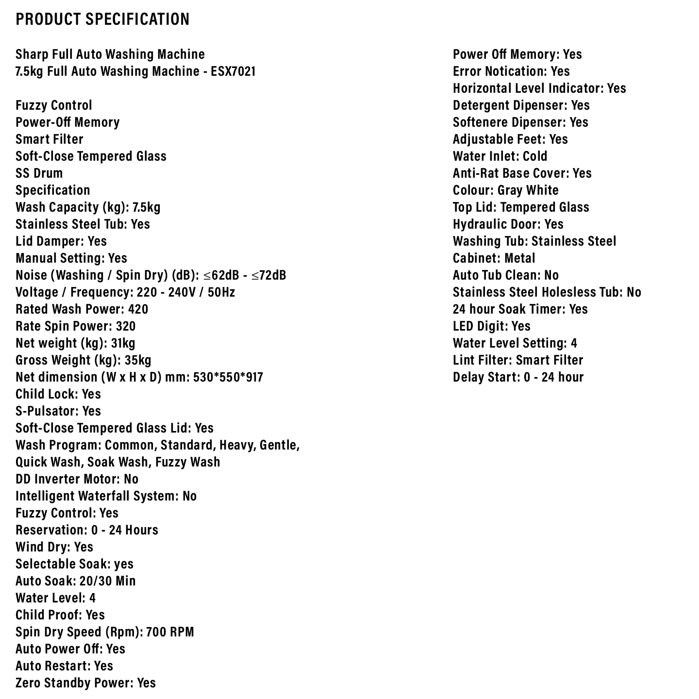 Sharp 7kg Top Load Washing Machine (ESX7021)