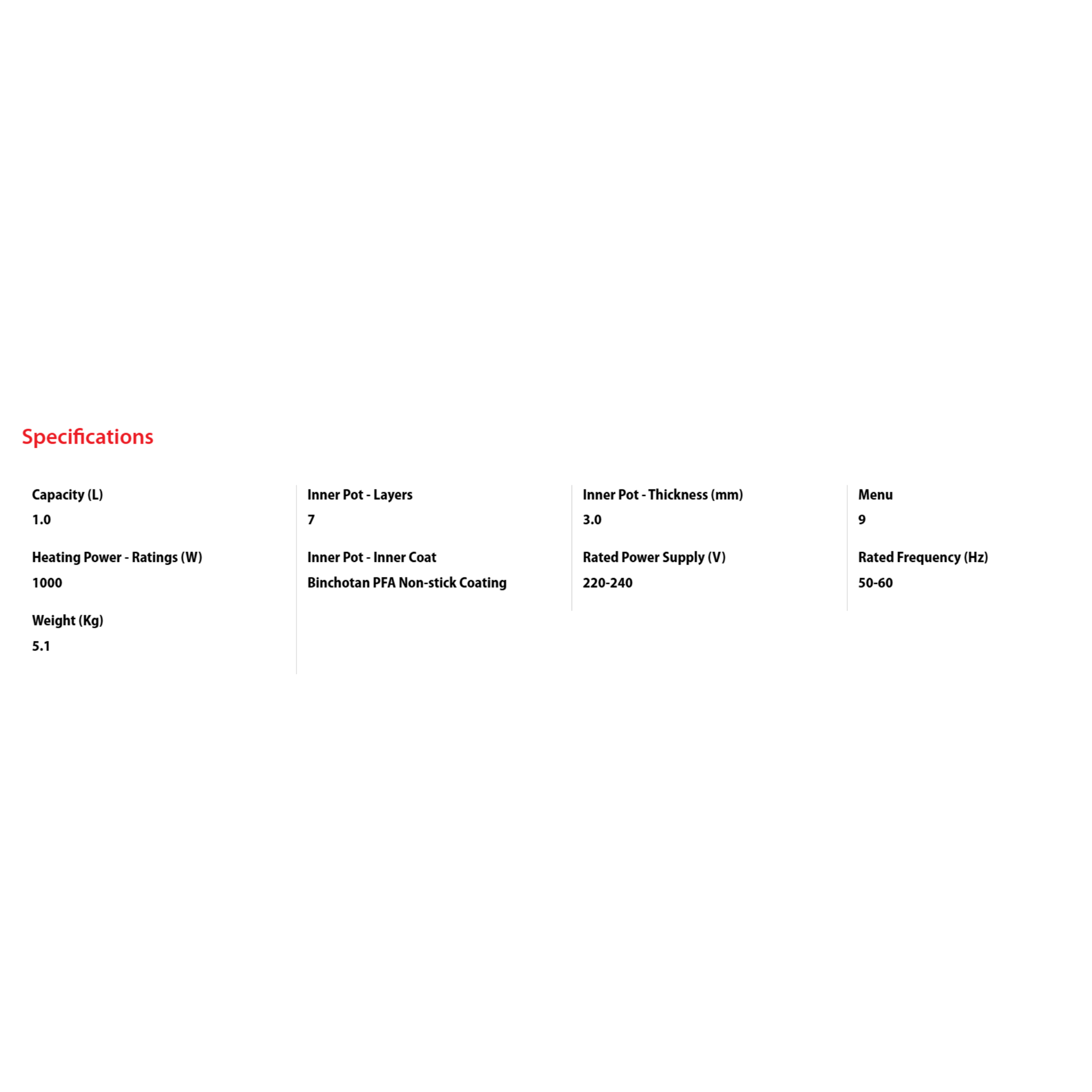 • Capacity: 1.0L • Type: Digital IH Rice Cooker (Low Sugar) • Features: Induction Heating (1000W), Low Sugar Function, 3mm 7-Layer Bincho Charcoal Pot, Touch Panel • Warranty: 1 Year General Warranty