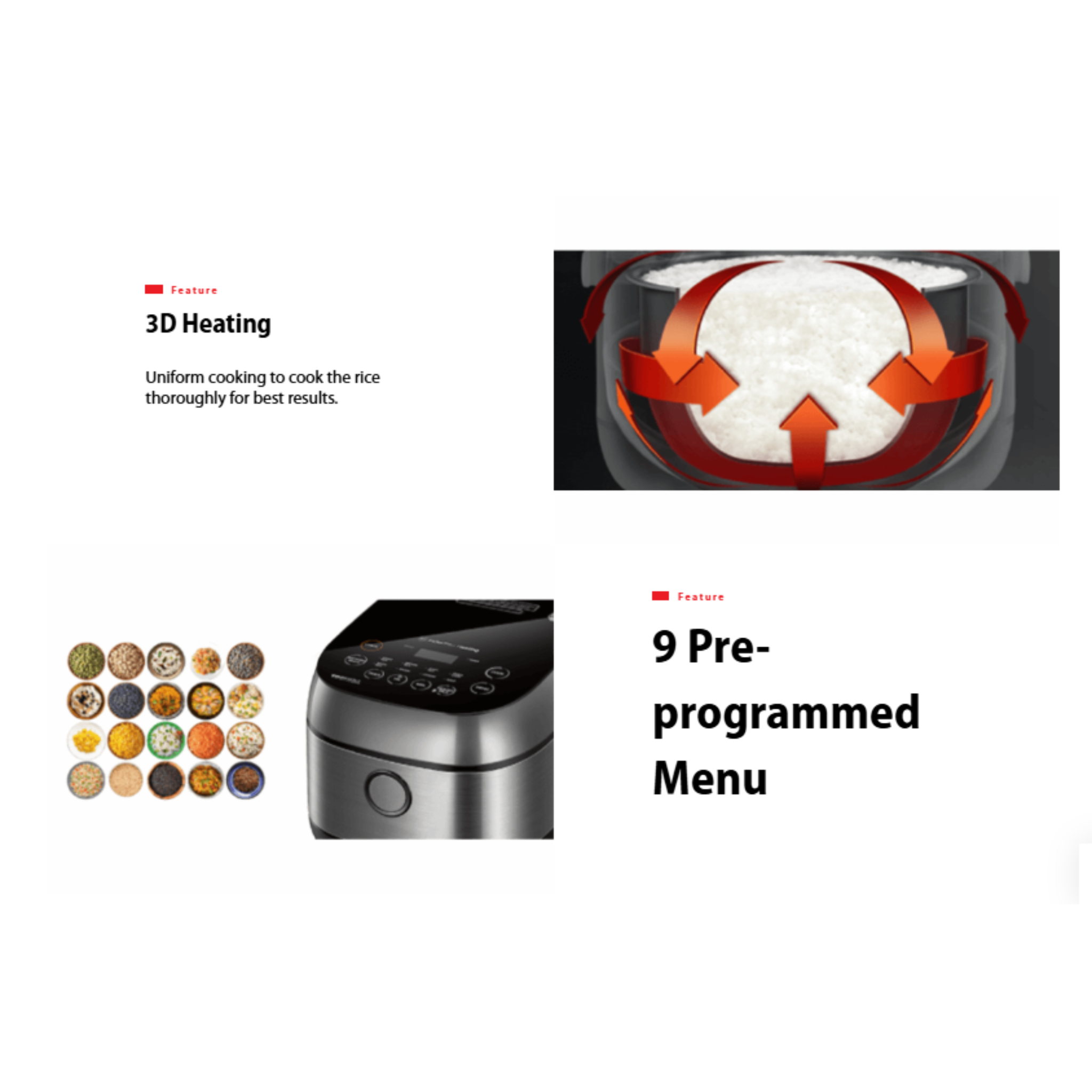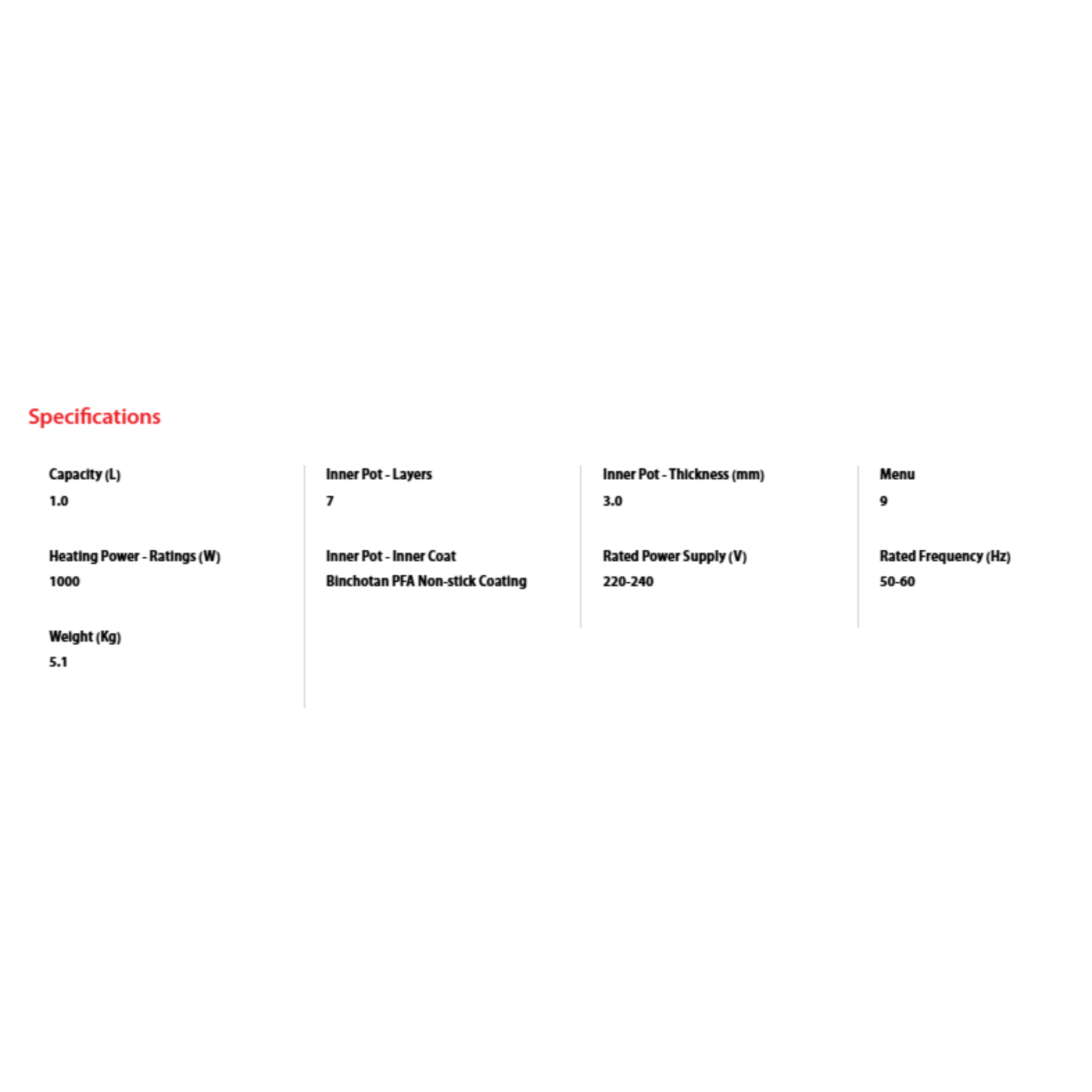 • Capacity (L): 1.0 • Inner Pot - Layers: 7 • Inner Pot - Thickness (mm): 3.0 • Menu: 9 • Warranty: 1 Years General