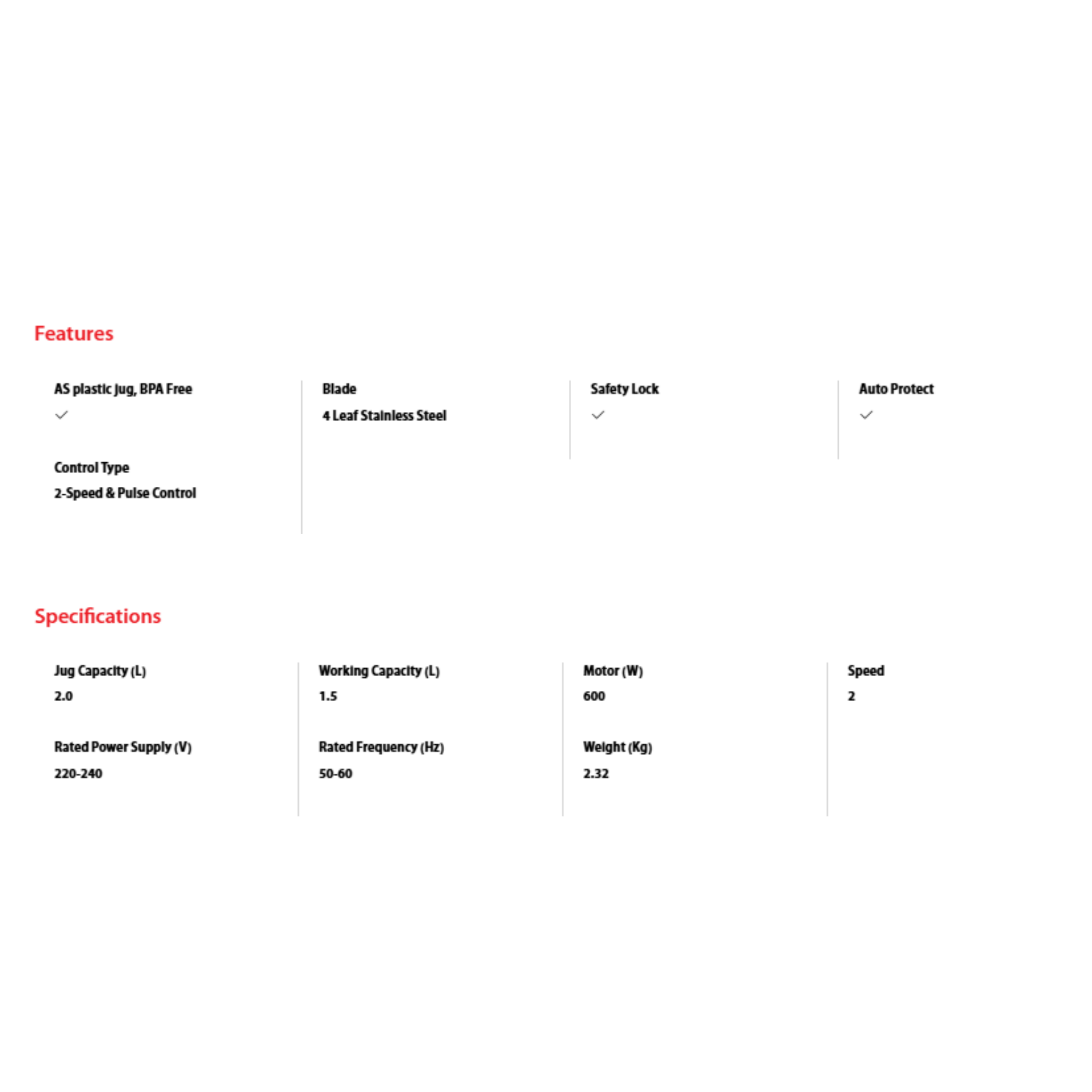 • Capacity: 2.0L (Jug) / 1.5L (Effective) • Type: Multifunction Blender • Features: 600W Motor, 2 Speeds + Pulse, 4-Point Stainless Steel Blade, Ice Crushing, Grinder Included • Warranty: 1 Year General Warranty
