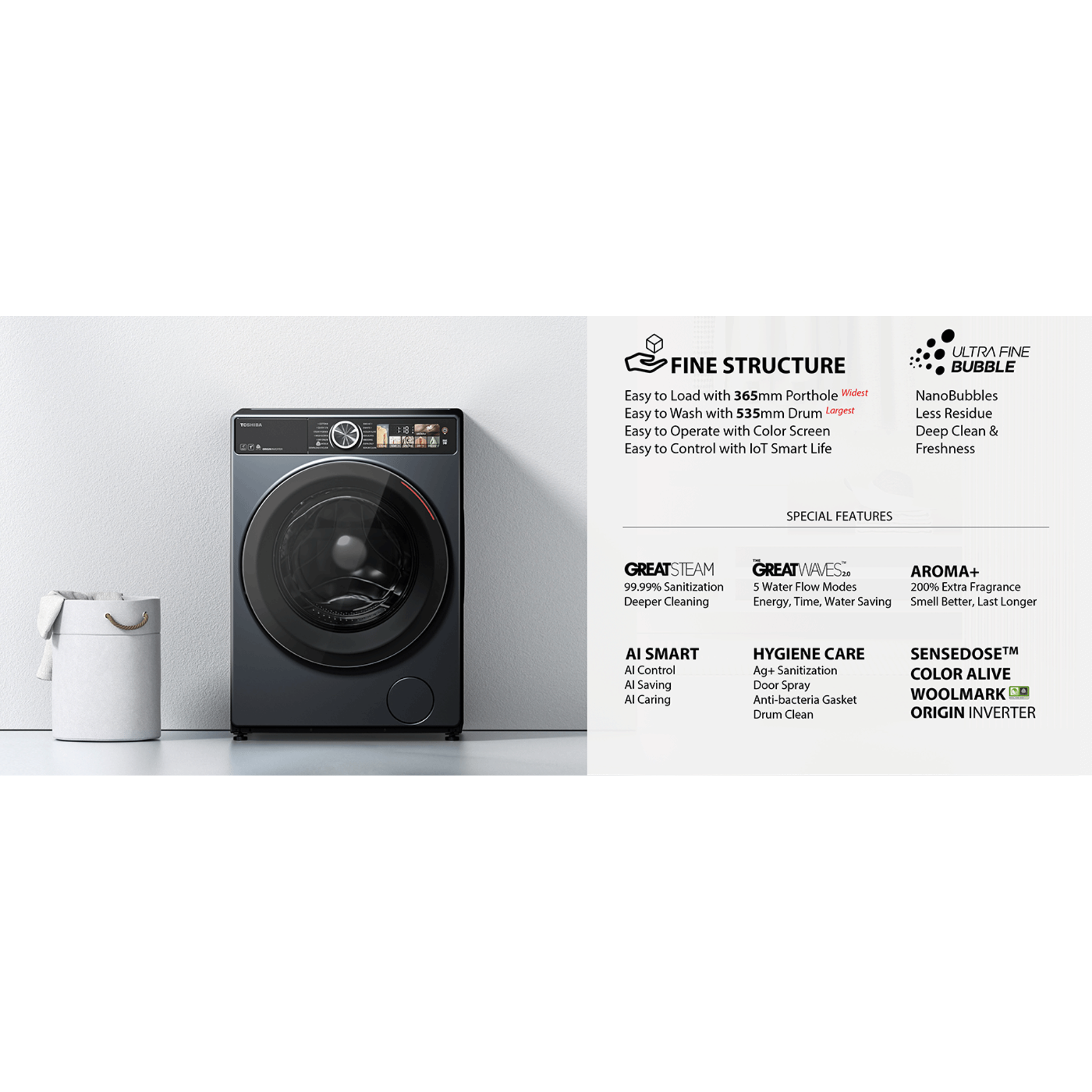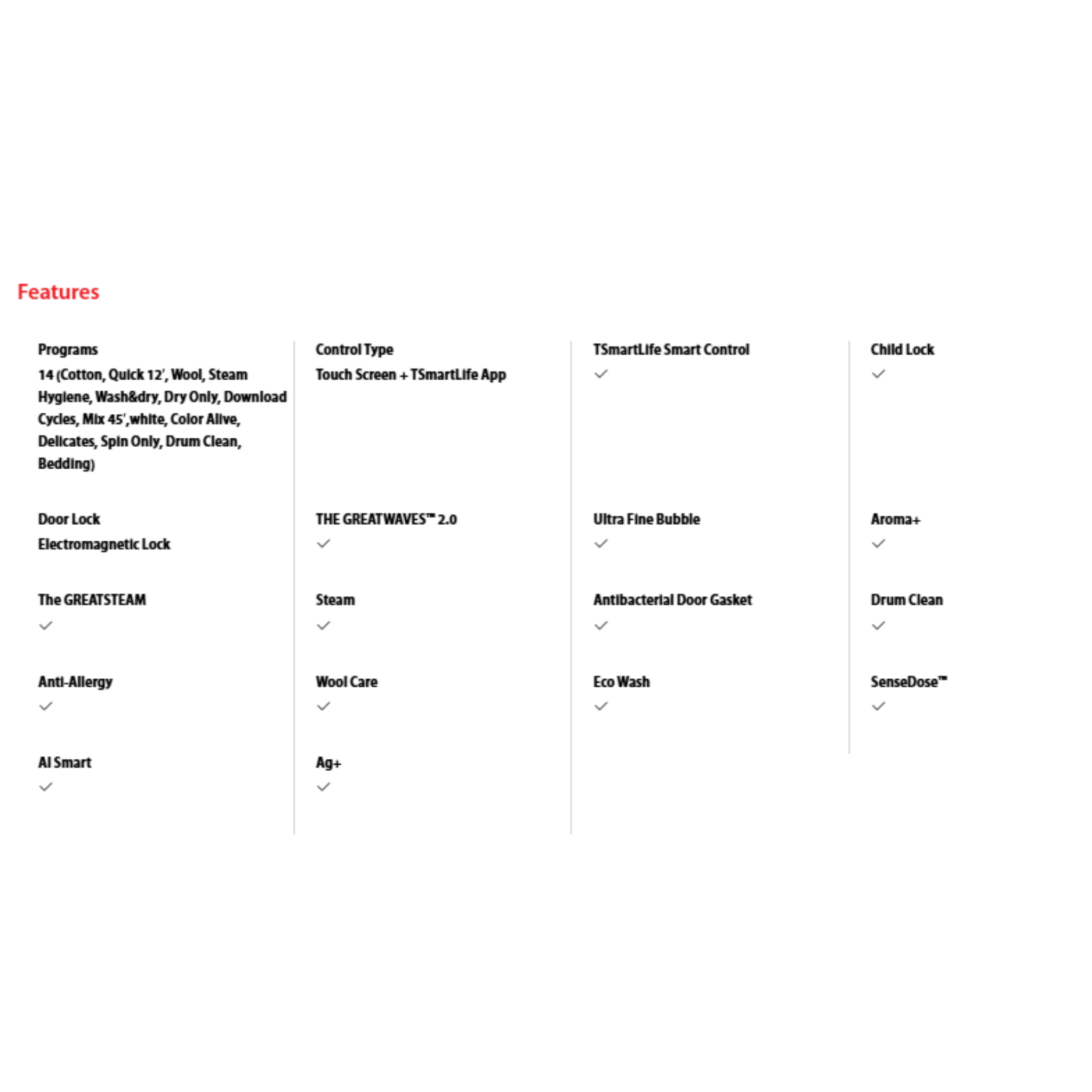 • 14 (Cotton, Quick 12′, Wool, Steam Hygiene, Wash&dry, Dry Only, Download Cycles, Mix • 45′,white, Color Alive, Delicates, Spin Only, Drum Clean, Bedding)