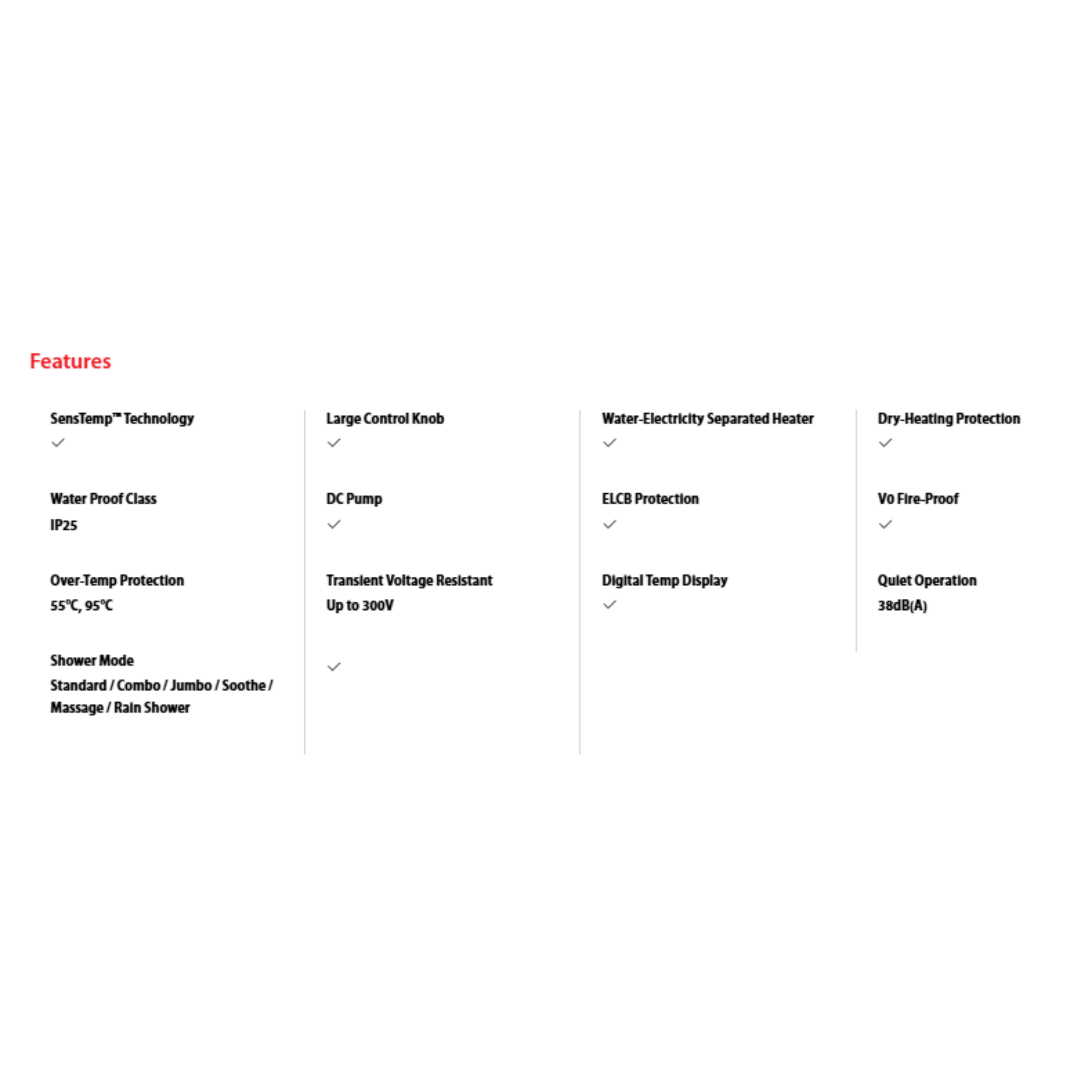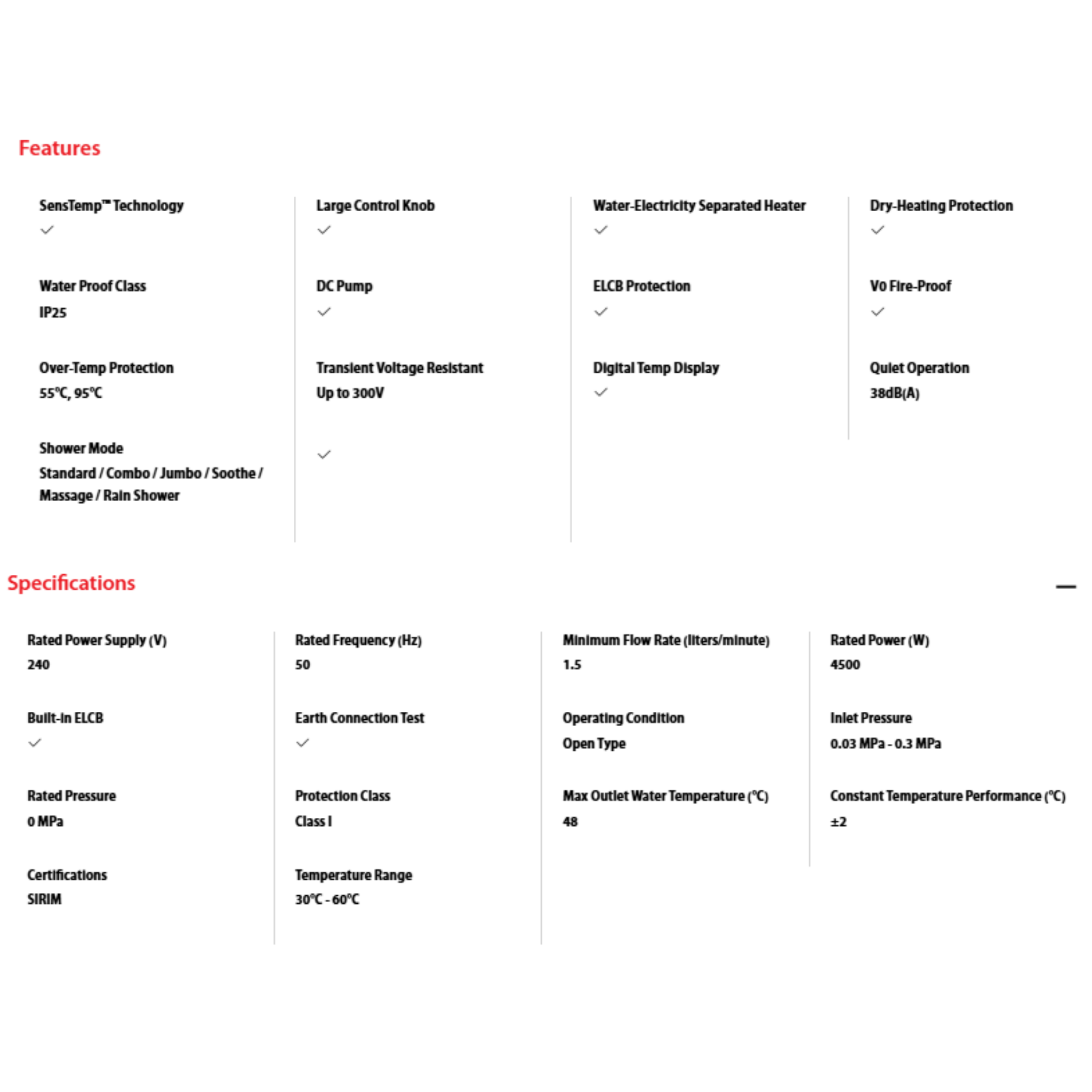 • Power: 4.5kW • Type: DC Pump Water Heater (Rainshower) • Features: SensTempâ„¢ Technology, Rain Shower Head, Digital Display, Silver Finish • Warranty: 2 Years General + 5 Years DC Pump + 5 Years Heating Element Warranty