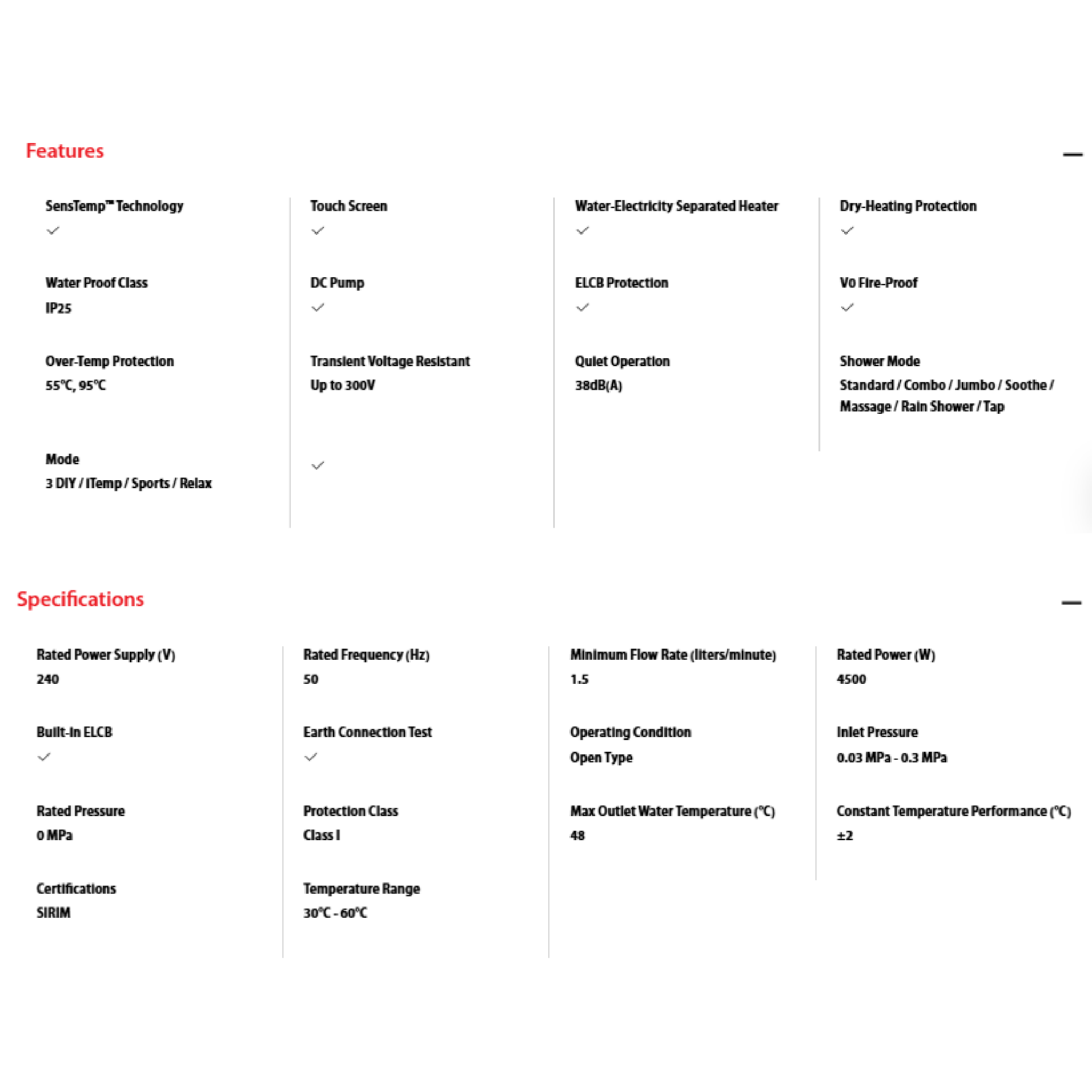 • Power: 4.5kW • Type: DC Pump Water Heater (Rainshower) • Features: SensTempâ„¢ Technology (Stable Temp), Rain Shower Head, ELCB, IP25, Black Finish • Warranty: 2 Years General + 5 Years DC Pump + 5 Years Heating Element Warranty