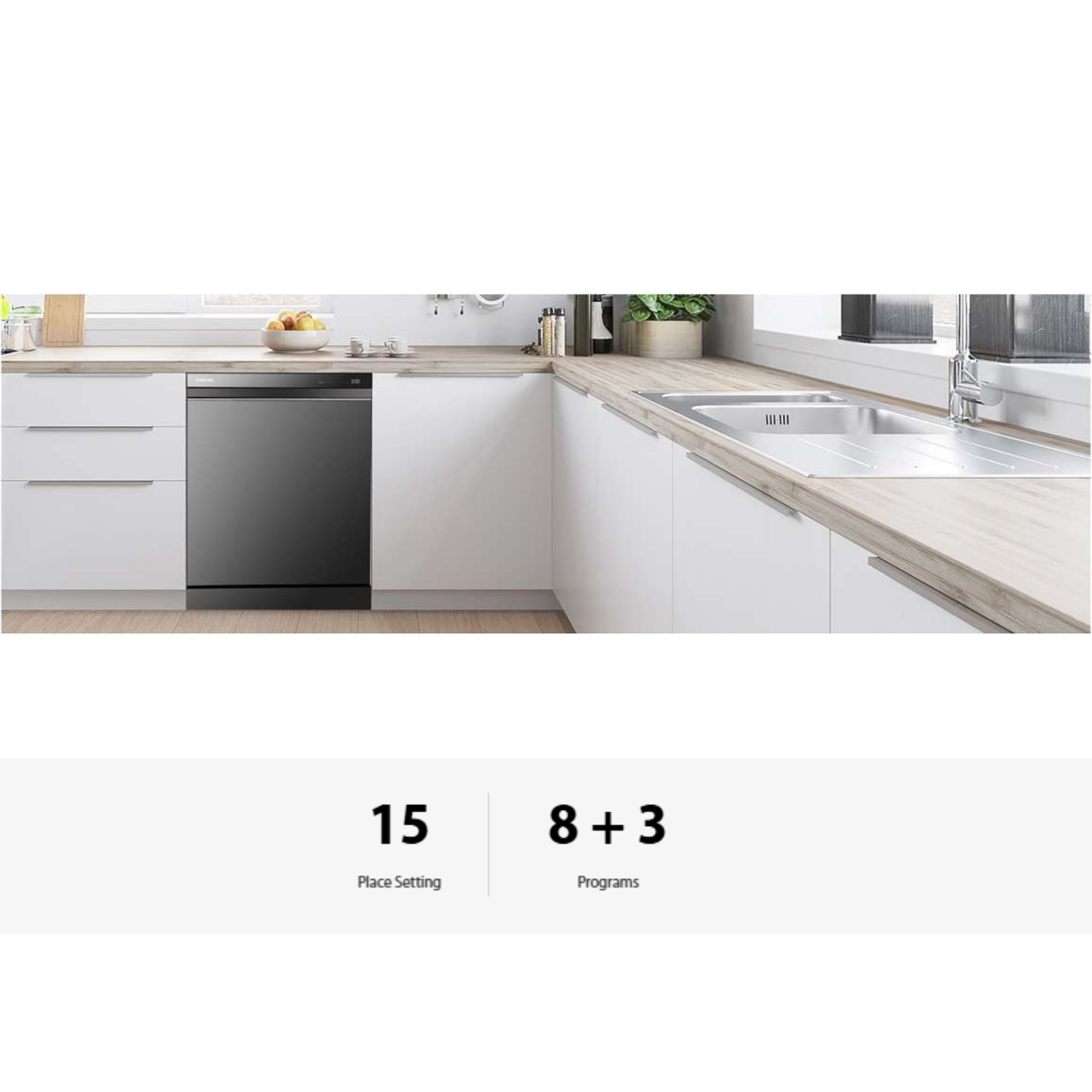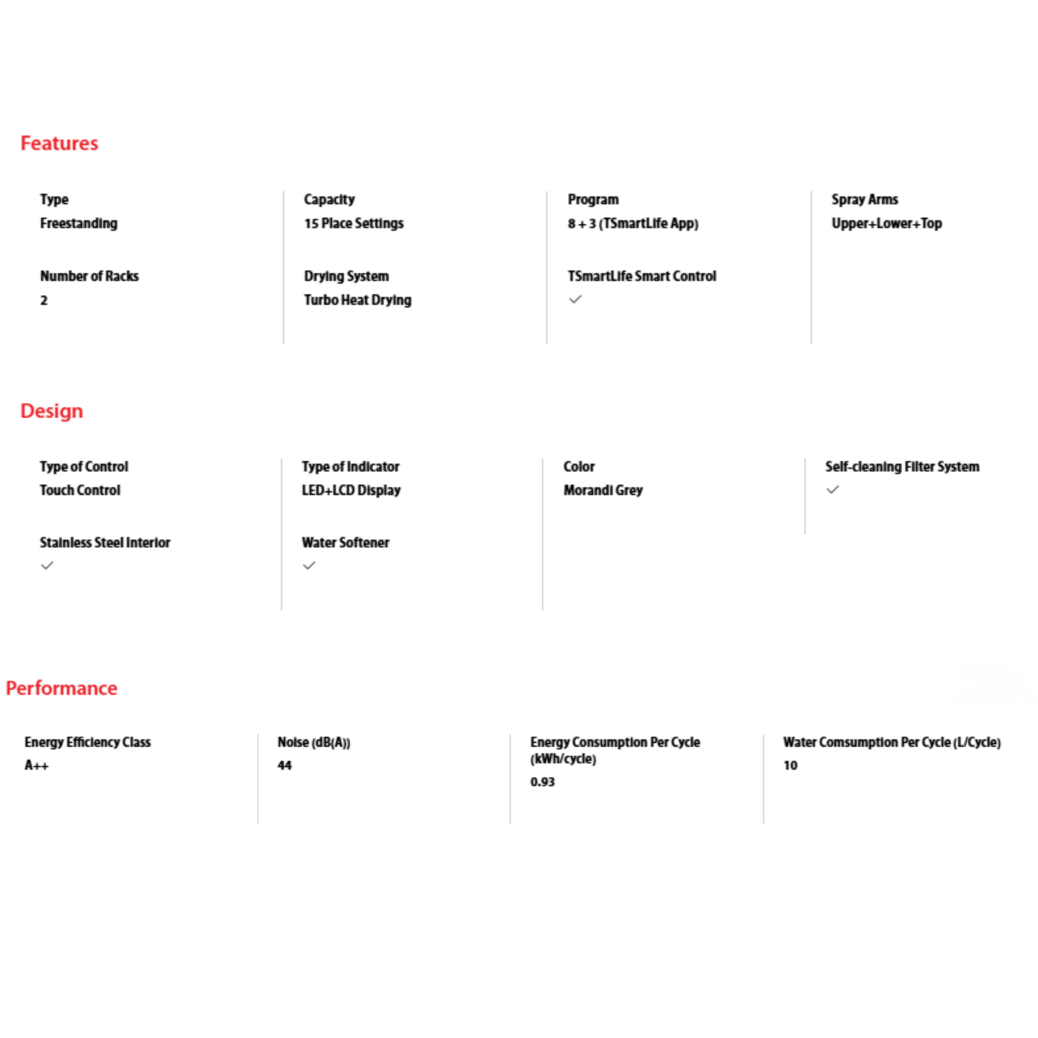 • Freestanding • Capacity: 15 Place Settings • Program: 8 + 3 (TSmartLife App) • Spray Arms: Upper+Lower+Top • Number of Racks: 2 • Drying System • Turbo Heat Drying • TSmartLife Smart Control • Warranty: 2 Years General