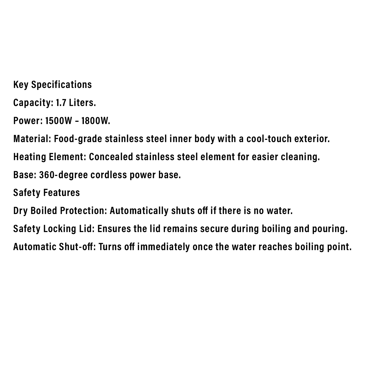 • Capacity: 1.7L • Type: Cool Touch Kettle • Features: Double Wall Insulation (Safe to Touch), 1800W Fast Boil • Color: Green • Warranty: 1 Year General Warranty
