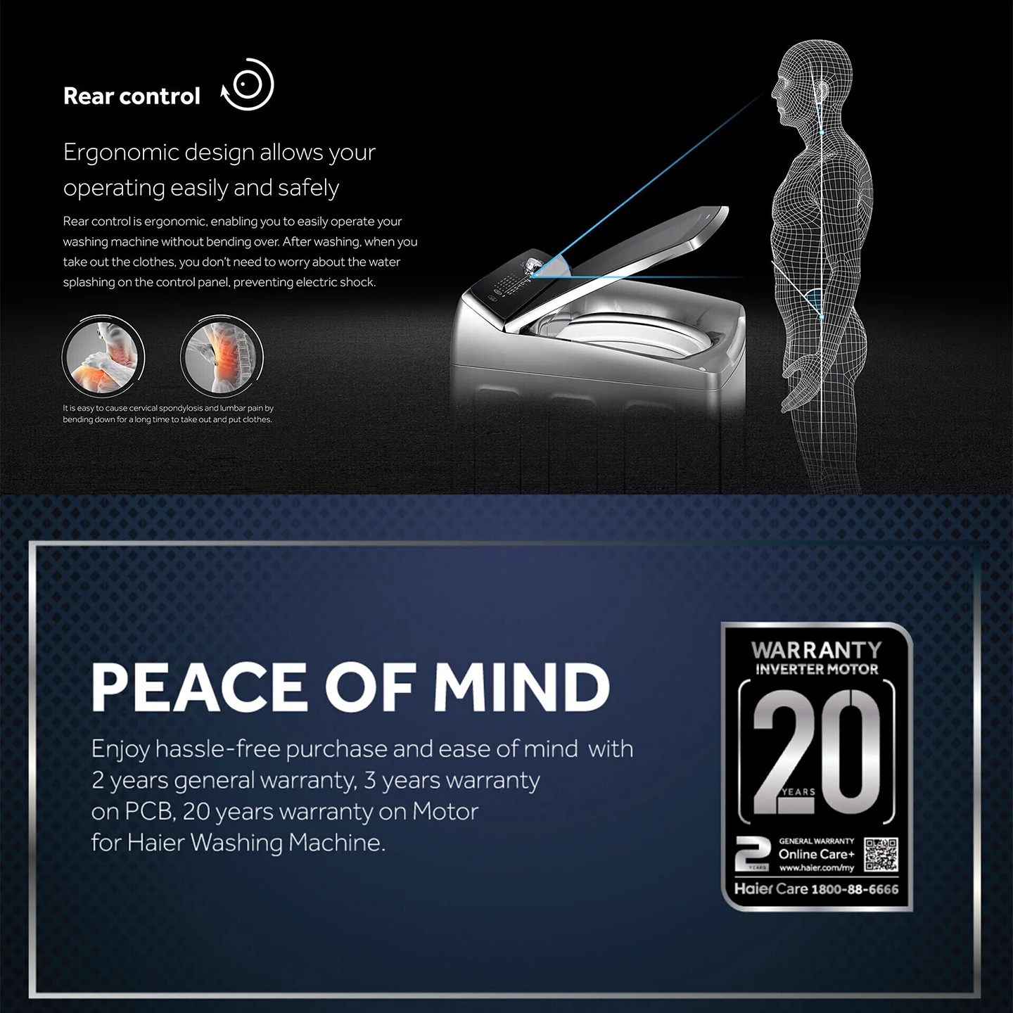 Buy Haier 15kg Inverter Washer (HWM150-B1678ES8). Features energy saving motor & self-clean. 2 Years General + 3 Years PCB + 12 Years Motor Warranty. Shop now.