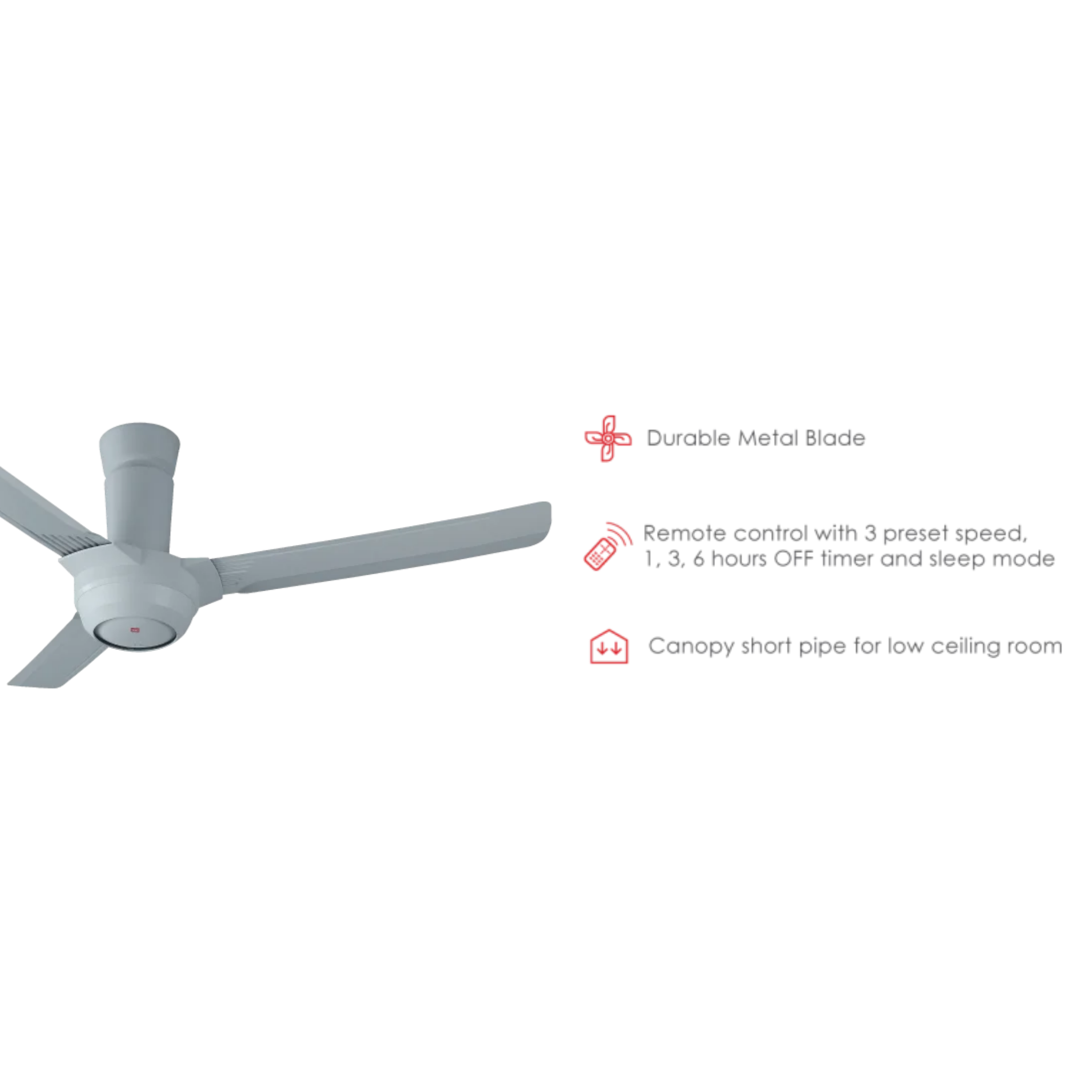 • Size: 56" (140cm) • Type: 3-Blade Remote Fan (Short Pipe) • Features: Designed for Low Ceiling (<3m), 3-Speed Remote • Color: Grey • Warranty: 1 Year General Warranty