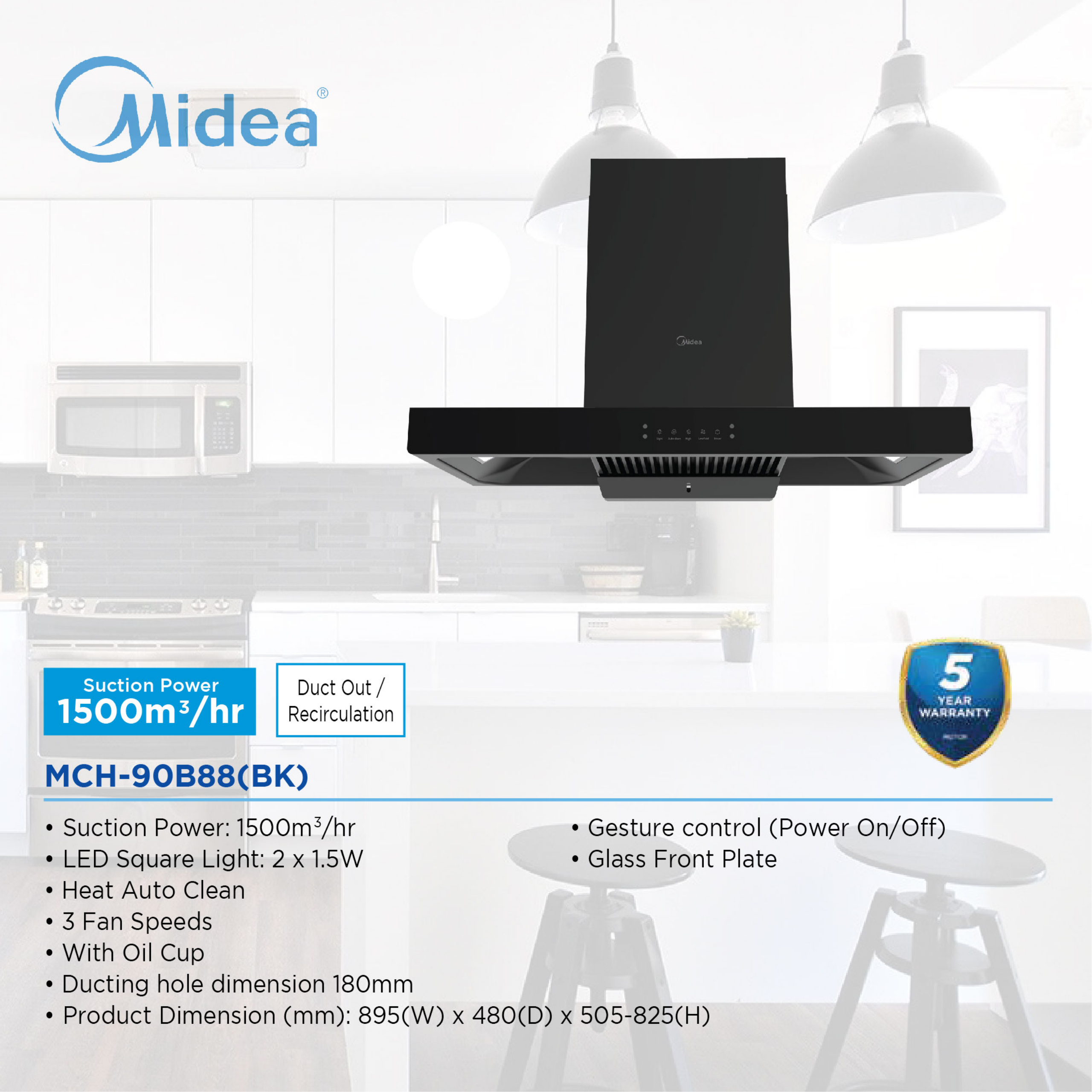 Powerful Suction: 1500m³/hr for effective removal of cooking fumes and odors. Easy Maintenance: Washable filter and easy clean elongated oil cup. Convenient Operation: Touch control interface and gesture control (hand wave power on/off). Versatile Settings: 3 fan speed settings to suit different cooking needs. Space-Saving Design: Compact dimensions (895 x 480 x 505-825 mm) for various kitchen setups