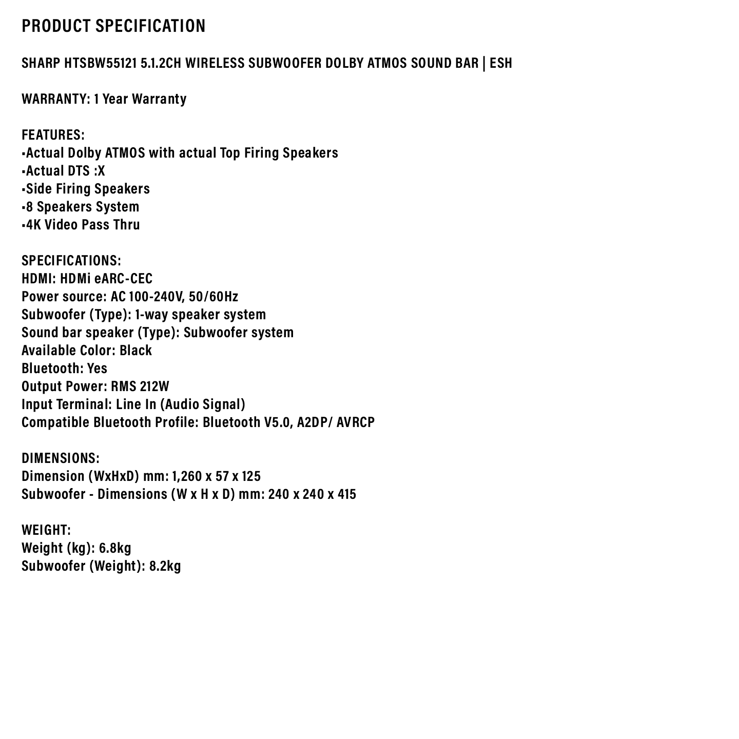 Sharp 5.1.2ch Dolby Atmos Wireless Subwoofer Soundbar (HTSBW55121)