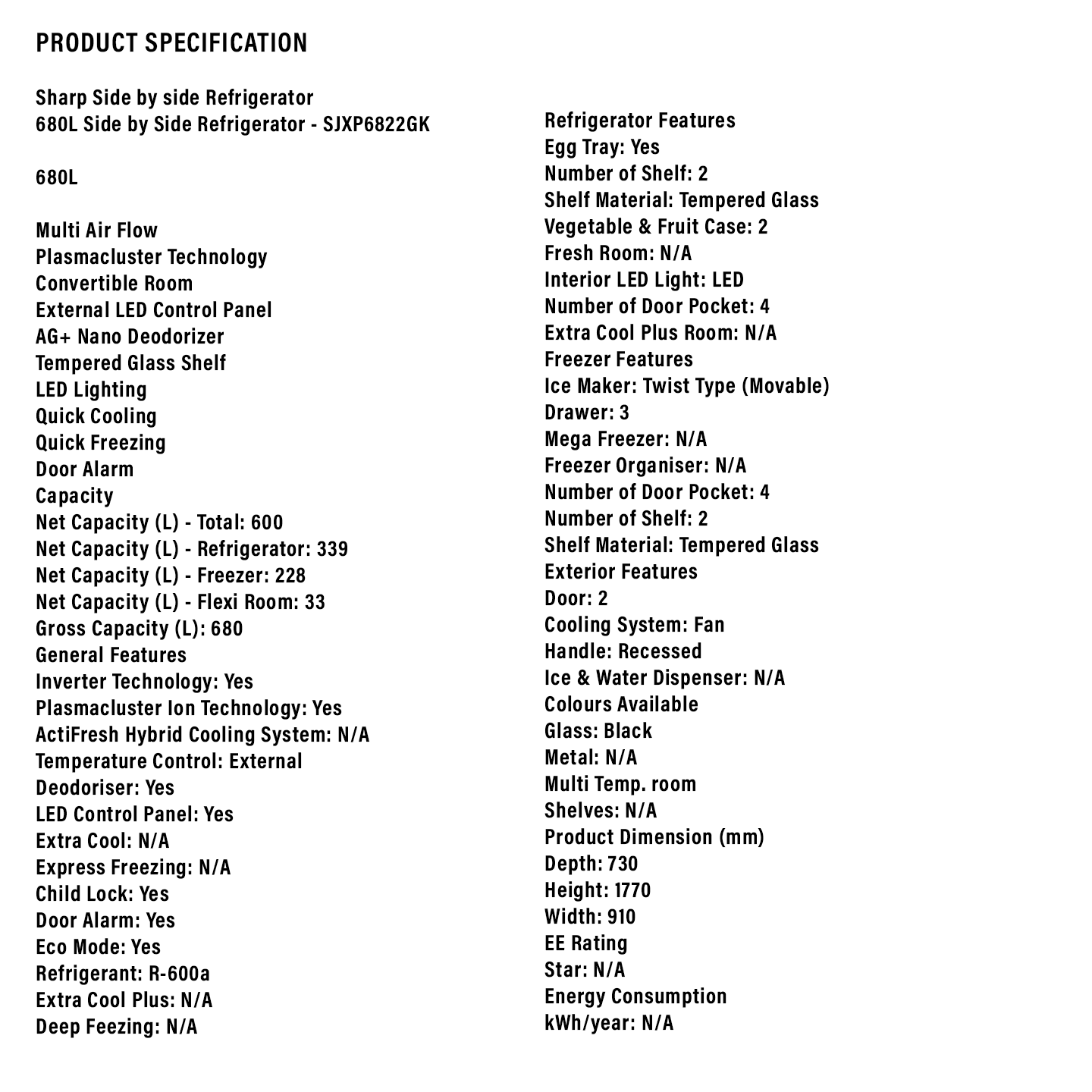 Sharp 680L Fridge SJXP6822GK. Elegant glass design with massive space. J-Tech Inverter tech. Plasmacluster ion care. Shop now for premium cooling.