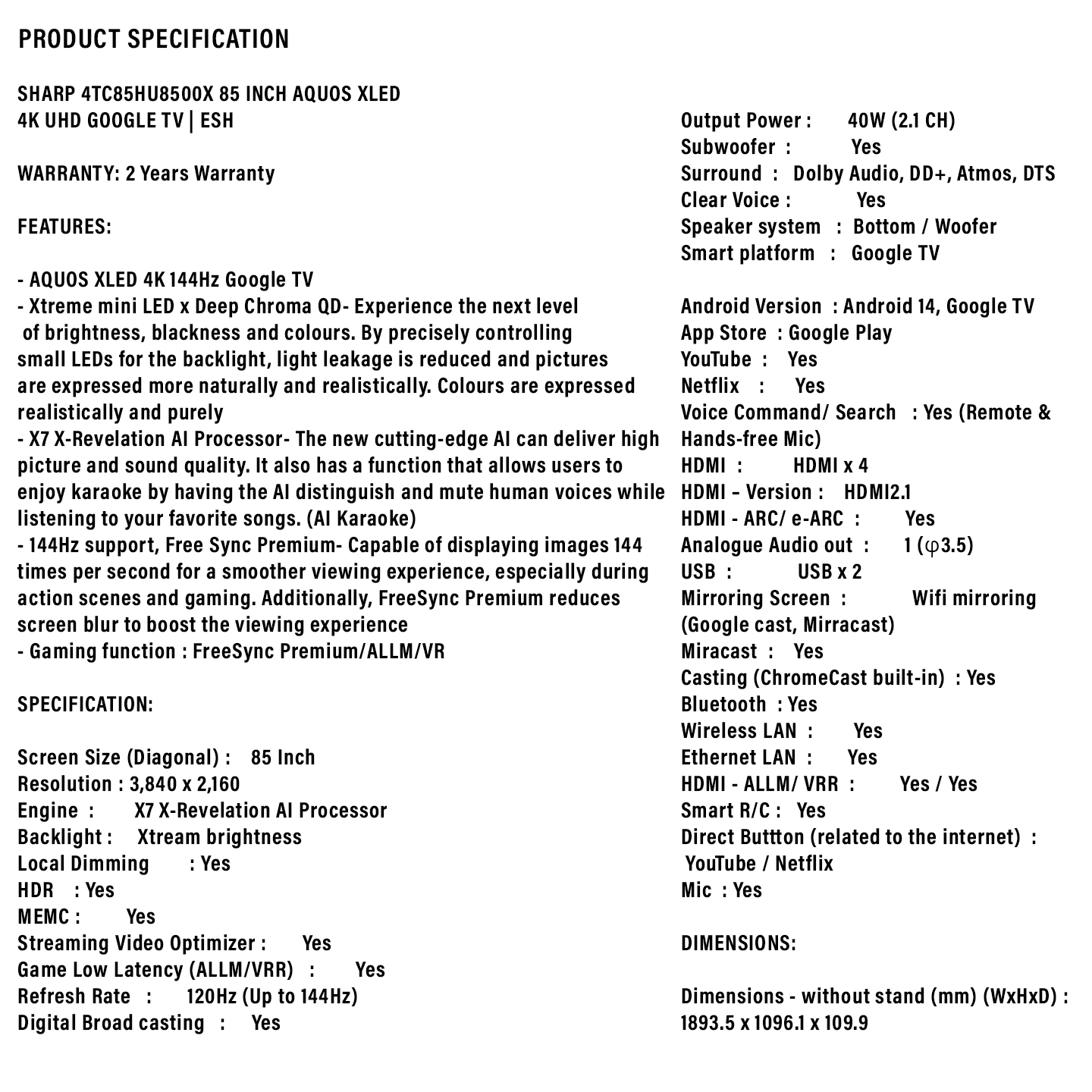 Sharp 85" 4K XLED Google TV 4TC85HU8500X. Next-gen XLED brightness. Google TV apps and 4K UHD. Order online for the best entertainment setup.